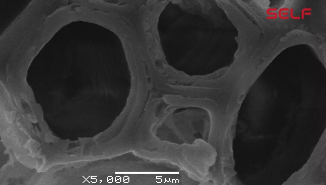 再把镜头进一步拉近,想看看它的墙究竟是怎么组成的?可以看到这幅场景,这个是在扫描电镜下的场景。发现这堵墙上面布满了密密麻麻排布的细丝,这些细丝叫做微纤丝,他们彼此交叠在一起。就像钢筋骨架一样,密密麻麻的排在一起。正是因为这些结构,让细胞壁变得十分的坚韧。