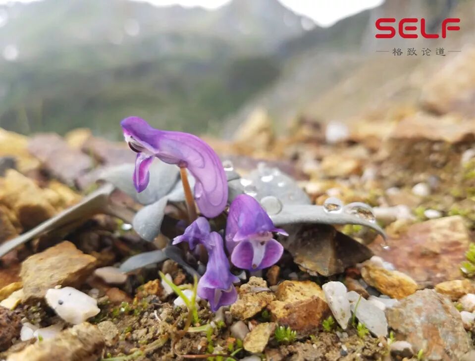 然后这个是什么?也是在云南拍的。叫做囊距紫堇。上海地区紫堇很高,非常高,但是在山区它有多高?大概两三厘米,而且这个紫堇的叶片跟石头的颜色是一样的,它不是绿色的,是红褐色的,非常矮,非常难以找到。只有在开花的时候,才能惊鸿一瞥,看到它的美丽。