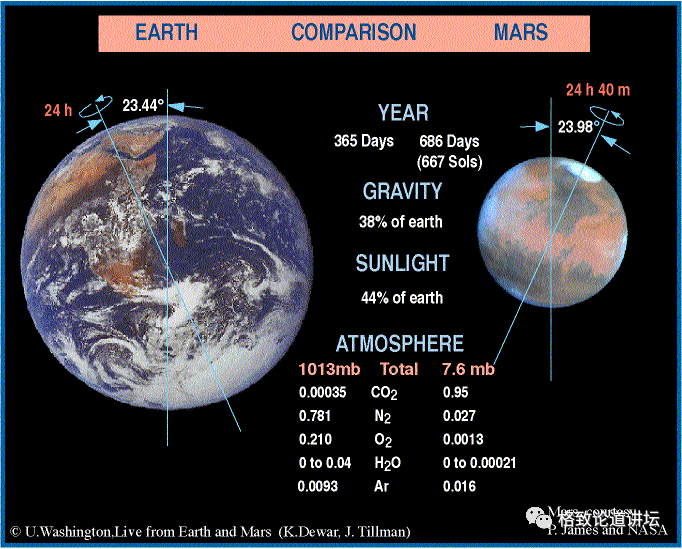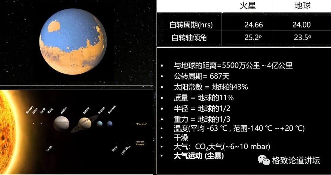为什么要选择火星呢?因为火星跟地球一样,自转轴也是歪的。歪了以后绕着太阳转,地球才会出现春夏秋冬的季节性变化,我们定了24节气,循环不已,北半球、南半球的气候完全相反,因为太阳的入射角和入射的通量有很大差别。