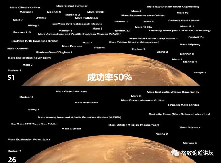 人类探测火星进行了51次,成功的大概只有26次,只成功了一半。我们中国只探测了一次,是成功的一次。