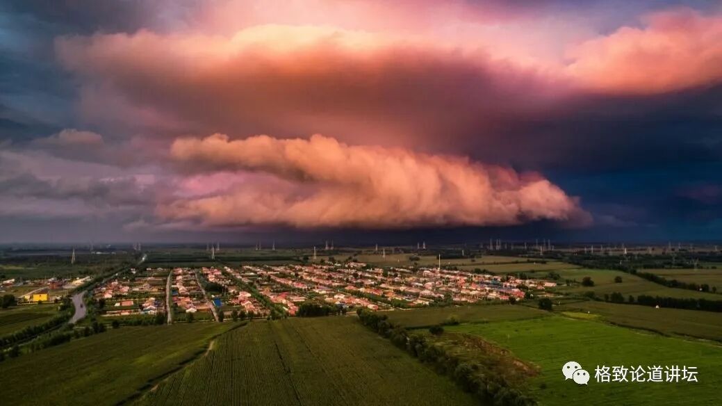 这本身是一个超级单体雷暴。它可能会带来非常恶劣的天气系统,比如说冰雹、大风、雷电甚至是龙卷风。龙卷风如果生成,就会出现在画面左侧这块更接近地面的云的区域,这叫云墙。