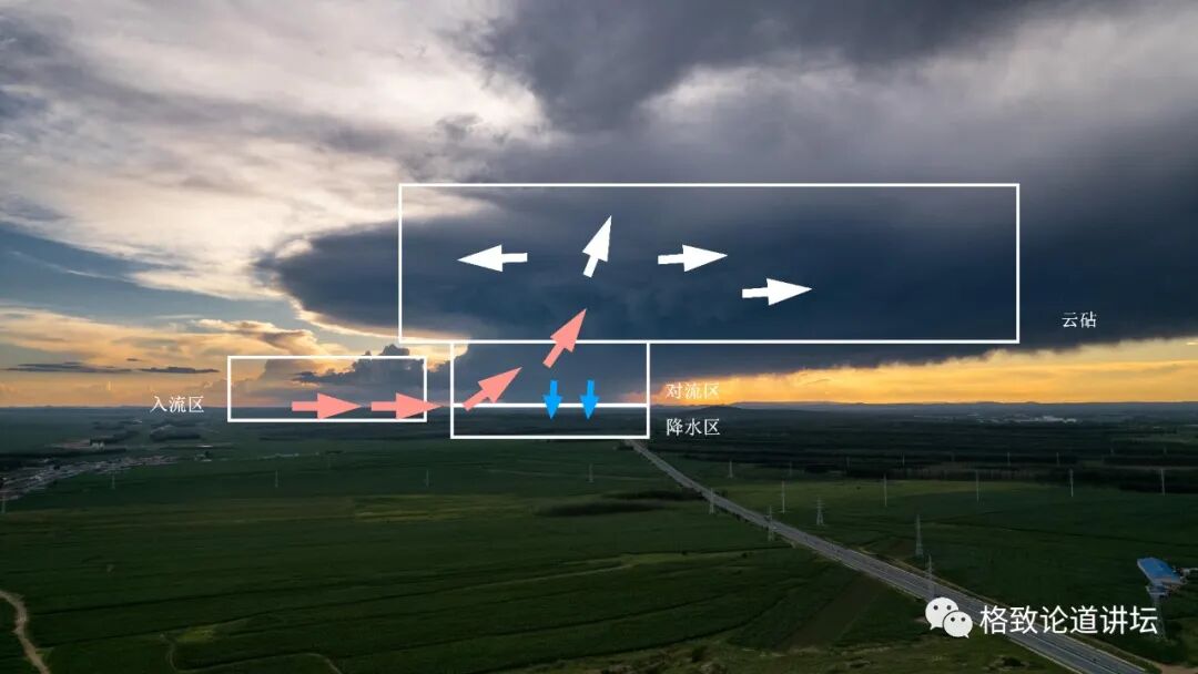 这个时候,这些暖湿的气团会开始上升,不停地凝结成云,降水就会同时形成,所以会有一块降水区,我用蓝色的箭头标记了,说明它是一块比较冷的、下沉的东西。当对流上升到一定高度之后就不会再次上升了,它会向周围扩散,形成一个云砧,就是在最上面标注的一个结构。