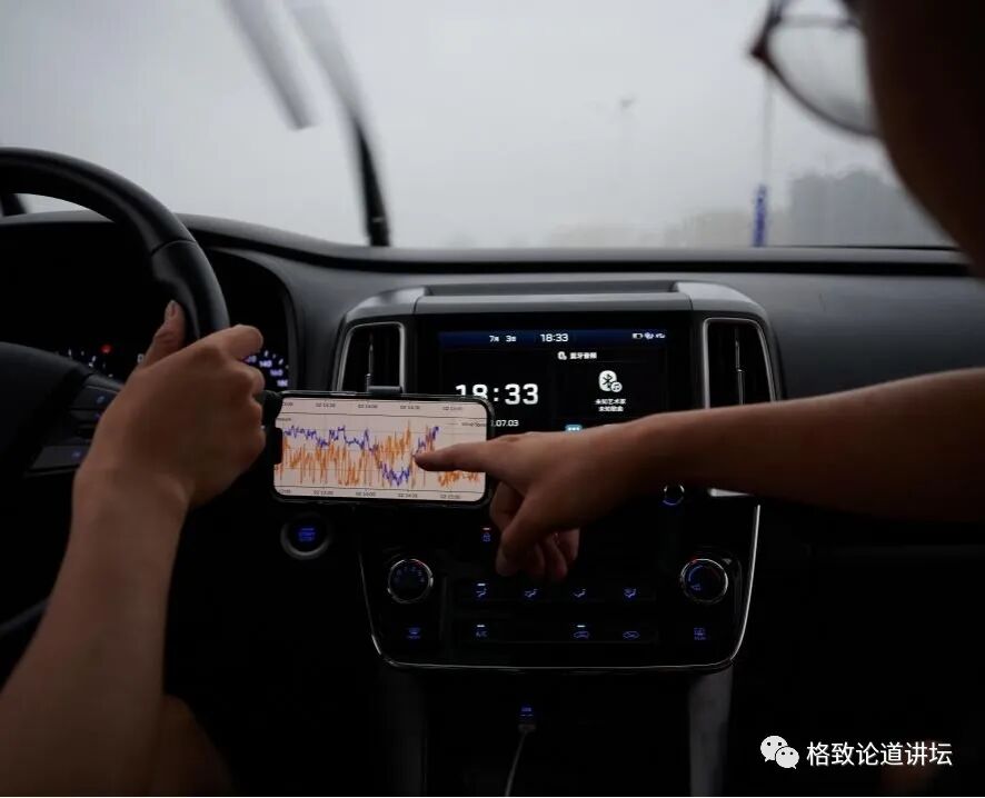 我们当时还做了一个非常大胆的决定,就是开着车直接穿越台风的中心。有点像用水果刀去切掉一个苹果一样,我们想要获得它横截面的一个气压曲线。直到下午,我们真正完成了这次穿越,看到了图像上这条蓝色的像V字形的曲线的时候,大家都特别地兴奋。因为这就说明我们经过了台风中心。台风中心是一块气压很低的区域,当我们经过中心之后,气压就不再下降,开始上升。这组数据就是我们的一个非常大胆的探索。