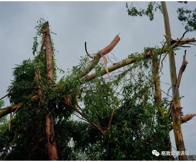 比如说这张图片就能很直观地说明台风过后的景象。风灾就会直接吹倒这些树木,甚至可能会破坏一些建筑。