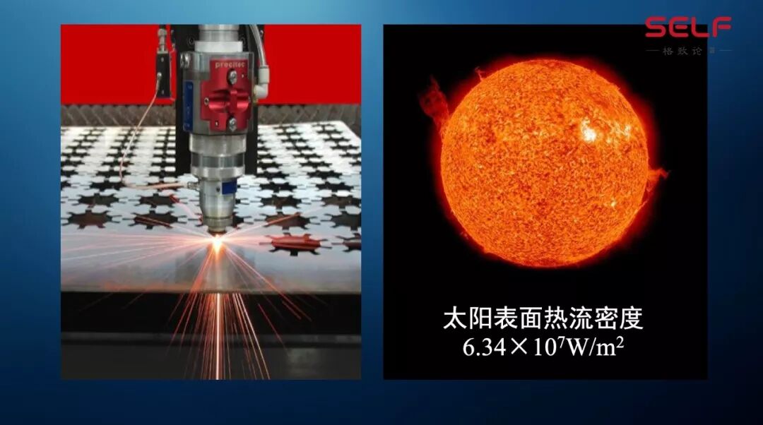 一平方毫米什么概念?大概你指甲盖的1/100,在这样小的面积上要有超高的热流密度,它才能产生那么强的激光,才能做激光的焊接、溶覆,我们刚才说的特斯拉工厂里面,焊汽车、焊飞机这种事情热流密度达到什么程度呢?达到太阳表面的热流密度,大概要到10^7每平方米,这也是非常非常难的。