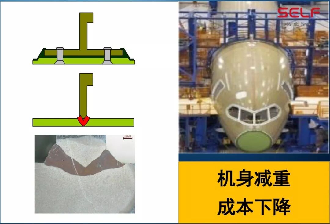 做这种汽车,比如说钢板的割焊接,还有这种,这个是空客A380的蒙皮,我们坐飞机看到飞机翅膀上有无数的铆钉,我们想用激光的焊接来替代这些铆钉,这样就能使机身减重整个成本下降。机身减重之后,可能我们这一堆人,就能坐在同一个飞机上了。