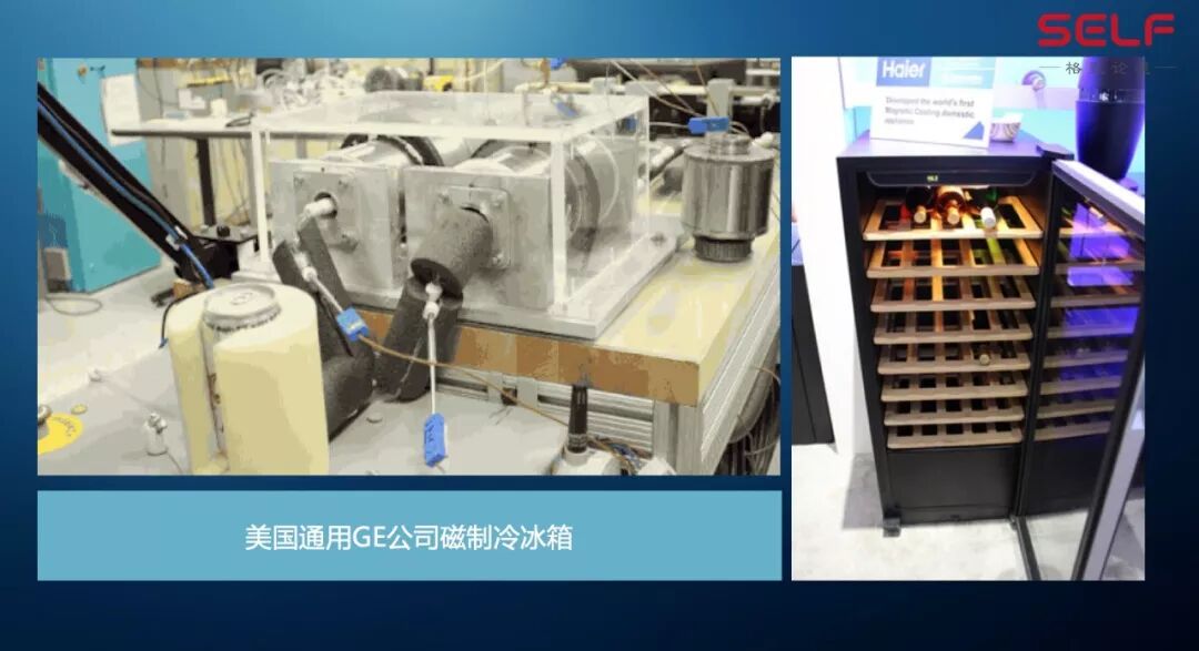 伦敦奥运会的时候,也有这样的应用,把这个啤酒放进去一会儿它就凉了。这是磁制冷冰箱,右边的是海尔公司制作的,海尔公司现在也在积极跟我们合作,这是他们的一个磁制冷酒柜,是用磁制冷这项技术做的一个酒柜,这是在2015年美国CES消费展上展出的一个酒柜。实际上海尔里面的这个机器是美国的一家公司制作的。目前为止,我们国家自主知识产权的磁制冷技术就是我们在做。