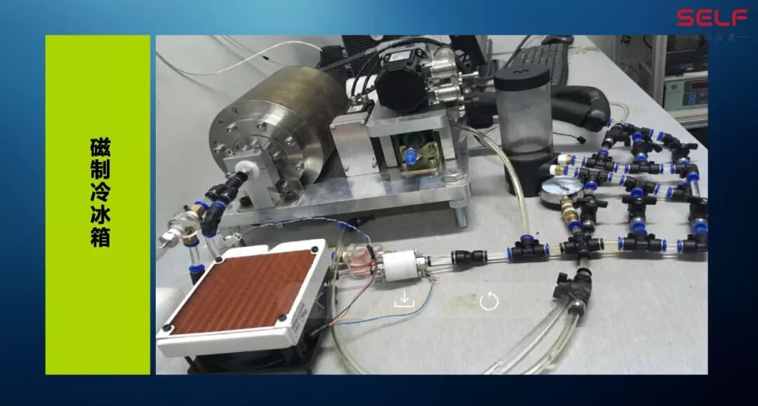 现在也有一些原型机,我们做的磁制冷机就属于原型机。这个是美国通用GE公司的原型机,可以看到它前面有一个啤酒,用这种磁制冷机把啤酒冷下来。