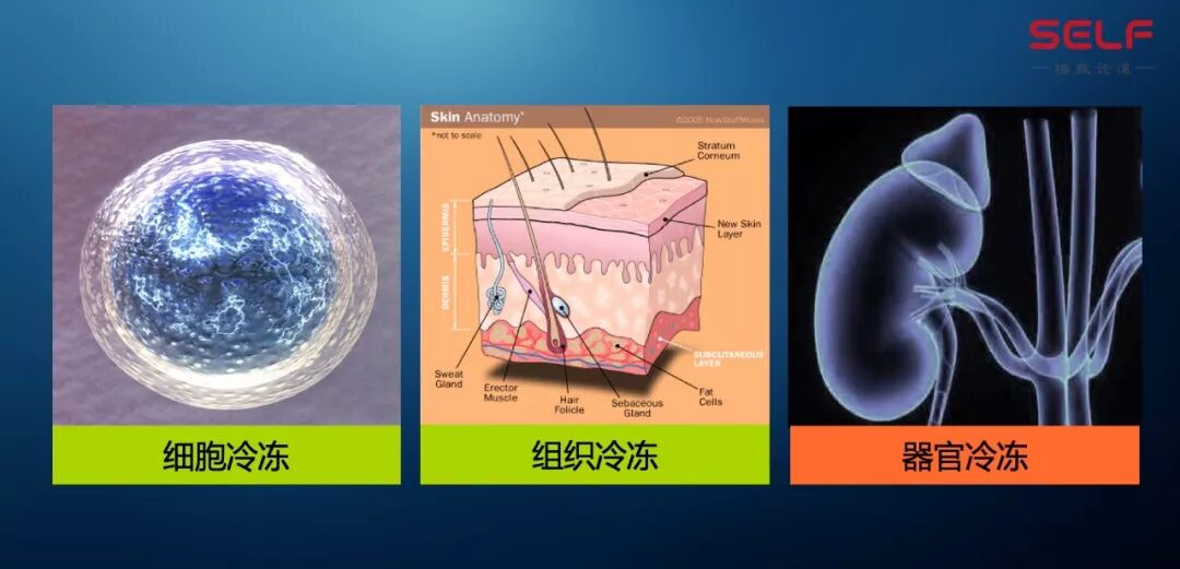 也就是说细胞层面的冷冻是可以的,另外组织的冷冻可以到什么尺度呢?比如说人类的皮肤、角膜,我们身体里面比较小的器官它也是可以的,比如说皮肤,在毫米这样一个尺度冻个十年二十年,再拿出来还是可以用的。所以现在有很多医疗机构、美容院,说要保存细胞,通过冷冻是可以达到目的的。但到目前为止,人体的器官、还有人冻起来之后,是不可能复活的。