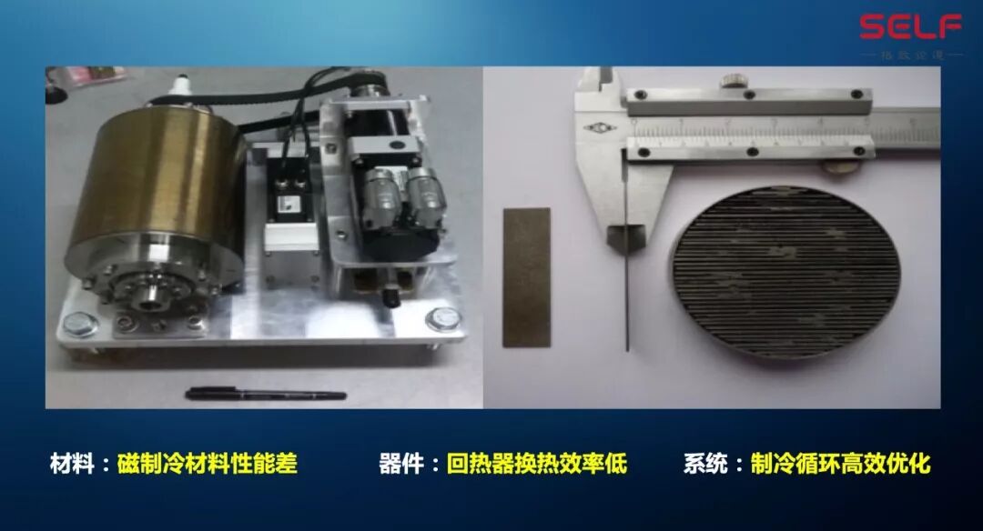 这个是我们实验室研制的磁制冷机,目前在市场上还不能够买到。因为我们现在还有材料的问题、回热器换热效率低、系统的制冷能力等等这样一些问题。但是我们正在逐步解决这些问题,几年之内吧,我相信你们能够在市场上看到了。