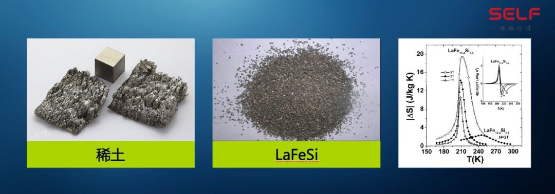 可以看到左边的这个图,它是一个稀土,中间是我们在磁制冷里面用的材料,它是蓝铁硅。氟里昂这种都是液体,我们不要液体了,我们用固体,把它放在什么里面呢?放在一个磁场里面,加上和去掉磁场的时候,就会产生温度的变化,然后把温度变化循环起来,它就是制冷了,这样就能够达到绿色环保的目的。