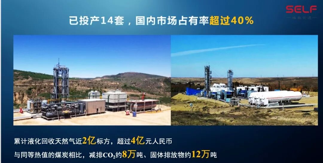 气采完了以后变成液体,能压缩六百倍,之后卖给这种天然气的加气站什么的,就直接可以变成钱了。这个天然气液化的装置,我们也做的非常好,我们为此成立了一家公司,现在内蒙、山西、陕西已经投产了十几套了,它的市场占有率现在能超过40%,同时也为二氧化碳减排等做一些贡献。