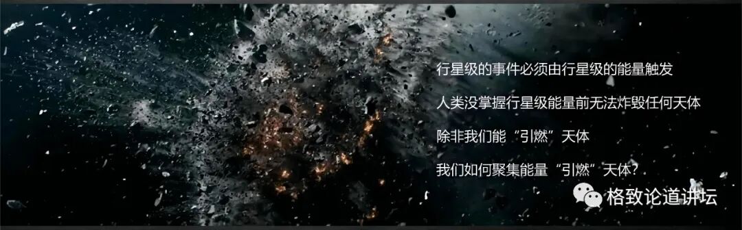 那怎么做呢?就需要释放我们的想象力。我们首先认识到:要实现行星级的事件一定要用行星级的能量。那我们就只有一个办法,让行星自己把自己毁掉。