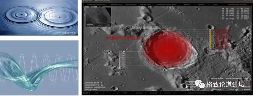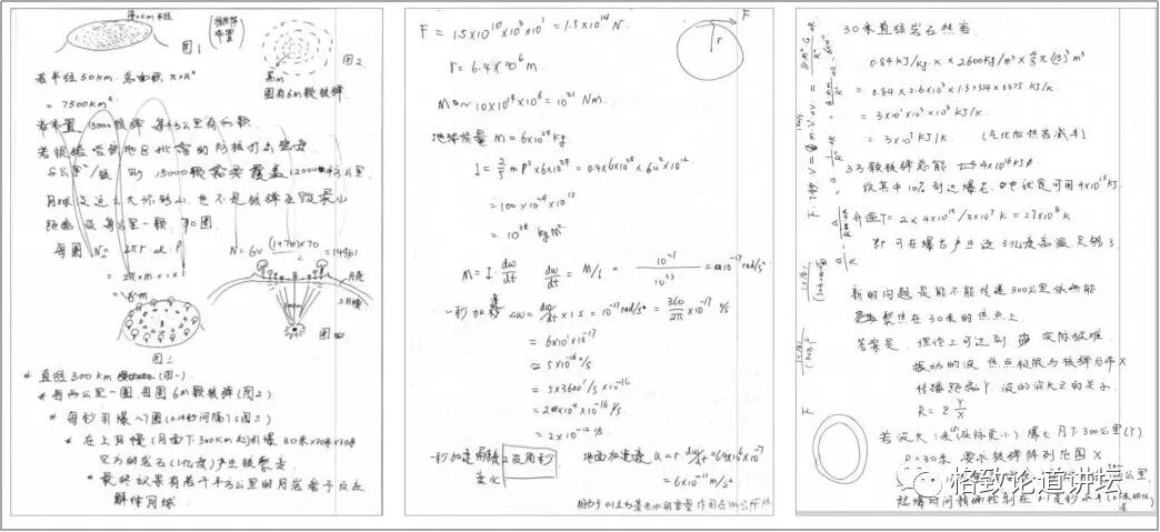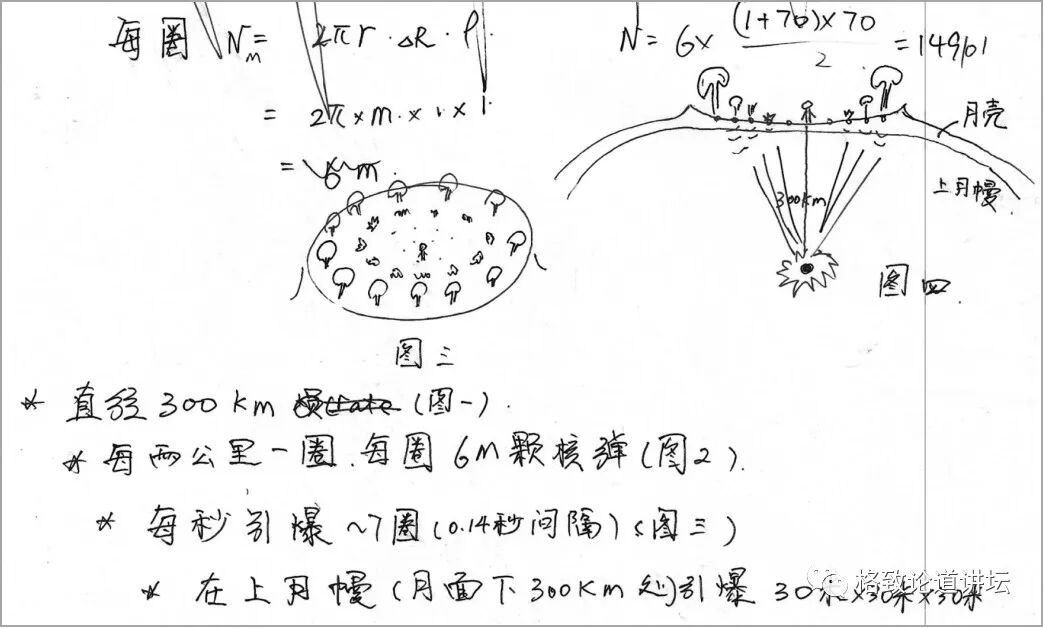 这是我给剧组画的一幅图。在月球表面放着这些核弹,这些核弹从外圈到里圈不断地引爆的时候,它的能量网聚焦在月球表面300公里之下。我们考虑到所有的能量损失,只聚焦它1/4或者1/10的能量,在30米左右的范围之内有可能实现上亿度的高温。于是我们说解决了,剩下的问题你们剧组去考虑吧。