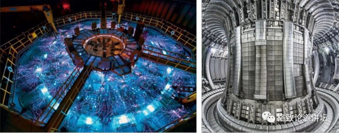 左边这个发着蓝光的地方就是中国现在正在努力的西南核研院的环流二号常规磁体的磁约束核聚变装置。右边是超导磁体,是我们科学院在合肥的托克马克装置。