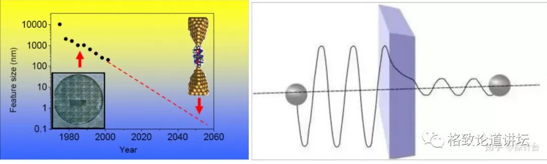 随着尺寸不断不断地减小,我们会进入到一个几纳米到1纳米的量级上,在这个量级上,所有的信息就就有可能穿过一个势垒直接过去,这叫隧穿。就像崂山道士的穿墙术一样,这是一种量子效应。