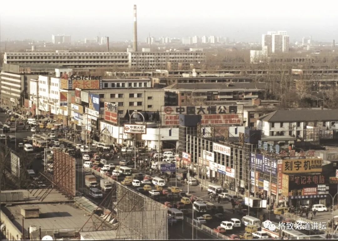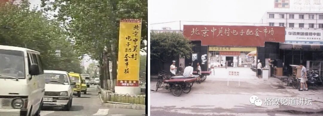 这两张照片大家可能没印象是在哪里,其实左边这个是在现在的海淀剧场跟海淀医院之间最繁华路口立的一块牌子,是我写的。写上去的目的是中关村要搞电子市场,因为许多企业当时起步的第一桶金是来自贸易。而且这个电子市场是当时其他地区没有的,是品种最齐全的市场,这个零部件集中的市场为中关村高科技发展奠定了供应链。所以我就写了这个牌子搁在那了。