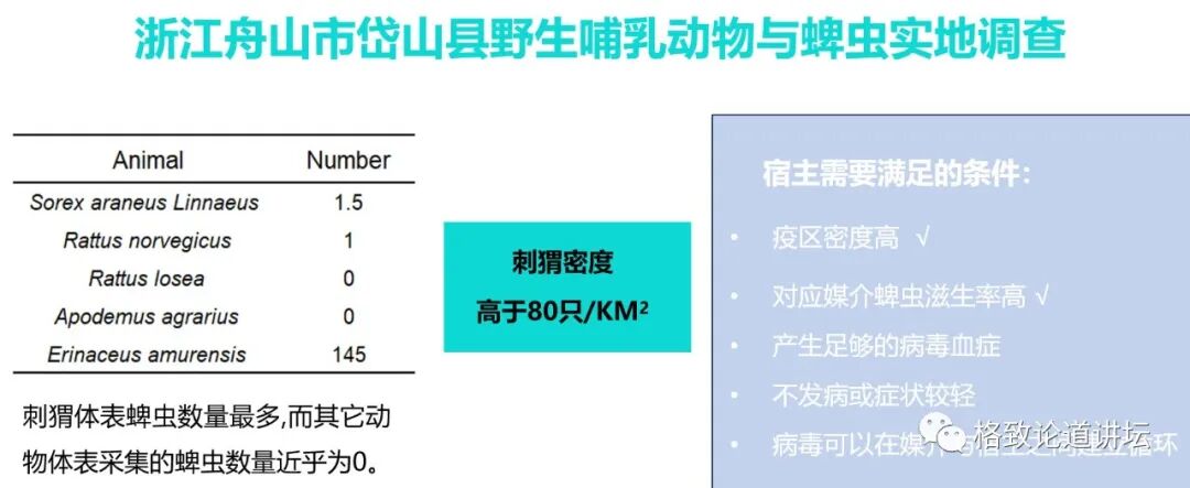 为了进一步证实,我们计算了它的密度。刺猬在舟山岱山岛密度很高,可以到80只/平方千米以上,另外它体表的蜱虫很多,平均每个有145个蜱虫。而其他动物像什么老鼠、鼩鼱,有的有一个,有的压根儿就没有。后来我们在全国其他疫区也做了调查,基本刺猬的密度都是大于100只/平方千米。这就满足了宿主的前两个条件。