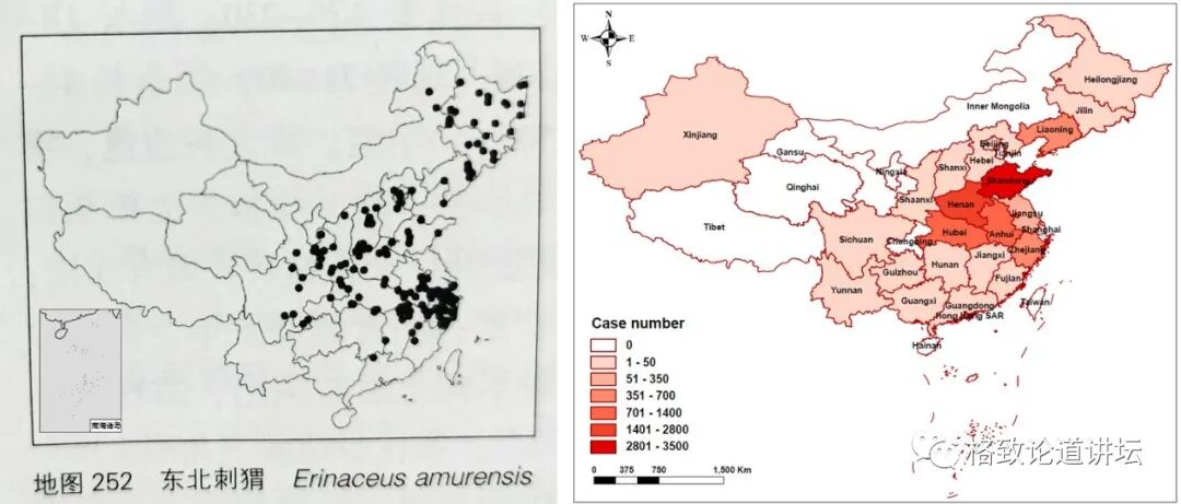 我们来看,东北刺猬的分布跟右面病例的分布,就是那个深色的区域,是不是基本上吻合?