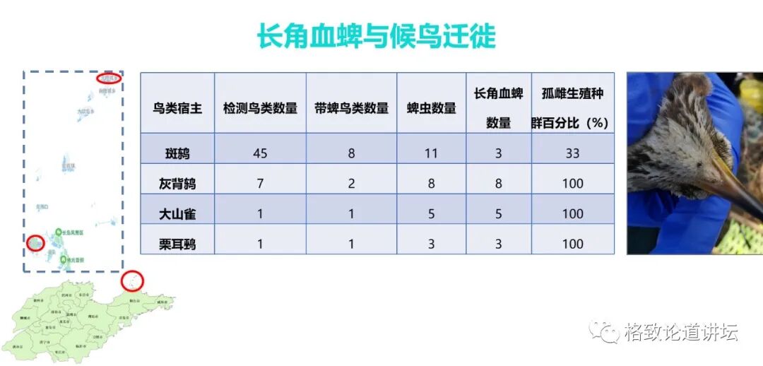 为了证明是不是孤雌的长角血蜱也会通过候鸟来扩散,我们去了疫情比较严重的一个地区,就是山东烟台的蓬莱市。那里有一个群岛叫长岛群岛,这个地方非常重要,因为它是候鸟跨过渤海湾迁徙的咽喉要道,鸟往北飞都要经过那个地方。