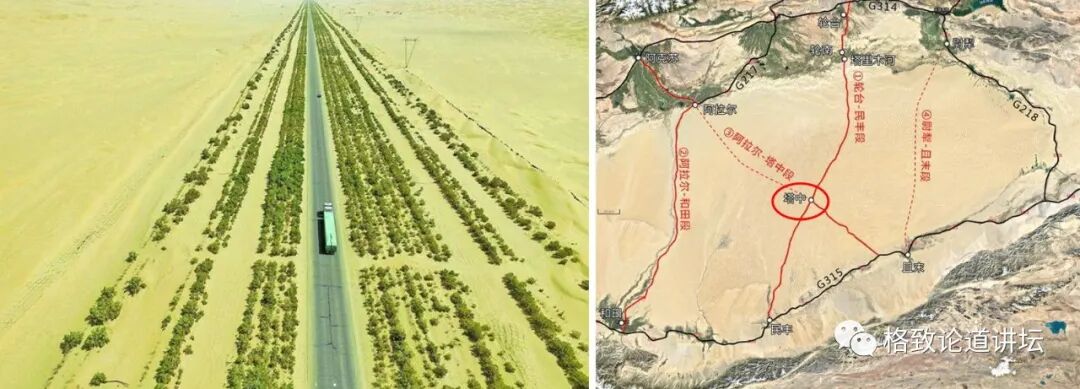 ▲ 左:沙漠公路 右:塔里木塔中镇位置