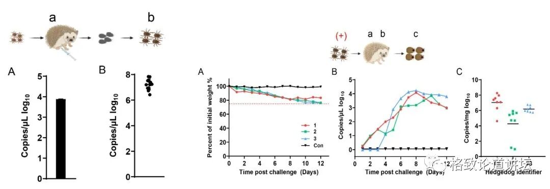那我们就做下一个实验,看刺猬能不能产生病毒血症,血里面有没有病毒。我们通过腹腔注射或者皮下注射给刺猬接上毒,发现它的体重并没有什么下降,但是它的血里产生了很多这个病毒。