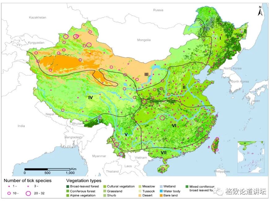 我们可以看到地图上这些红点,这是蜱虫在我国的分布。实际上据统计在1000多个县里面有120多种蜱虫,分别属于9个属。也就是说,不管是大漠、高原还是非常偏远的小岛,都有它们的身影。