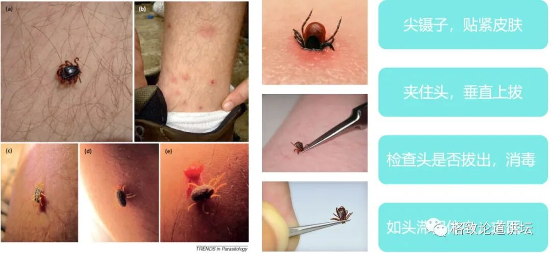 还有一个重要问题,如果你被蜱虫叮了怎么办?蜱虫一般在哪里叮?平常挠不到的地方,比如膝盖的后面、腰部、腹股沟、腋窝,还有什么发迹线、耳朵后面这些地方。如果你发现以前皮肤白白净净,忽然多了一个痣或者一个痦子,那就得小心一点了。