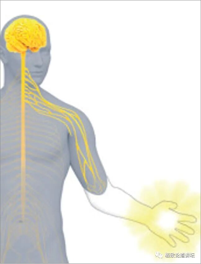 根据前面的介绍,我们知道固定的伤害并不代表固定的疼痛,这两个是可以分开的。还有一个重要信息是什么呢?疼痛是产生于大脑的,没有脑子就没有疼痛。所以虽然平常生活中我们说手疼、脚疼,但疼痛实际上都是产生于大脑。