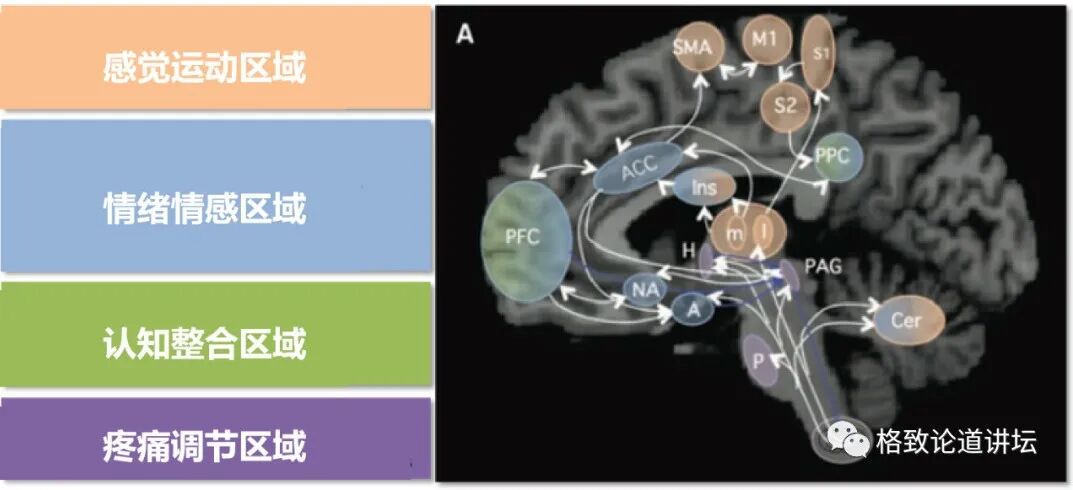 比如这里的黄色的是负责感觉运动的区域,它会告诉我们疼痛从哪里来、有多强、疼痛的时候我应该怎么办、应该缩回手还是怎样?蓝色是负责情绪情感的区域,它会告诉我们有多么讨厌疼痛。绿色的是认知整合的区域,它让我们思考疼痛的后果是什么,如何去应对它。还有一个很重要的区域是这里的紫色部分,就是疼痛调节的区域。