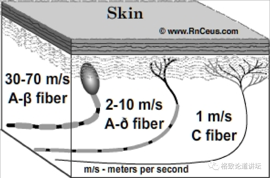 400年过去了,我们对疼痛的认识更加深入了。我们了解到,我们的皮肤当中有各种各样的感觉纤维:有粗的Aβ纤维,是感觉触觉的;还有比较细的,如Aδ纤维和C纤维这两种纤维,主要负责疼痛中的快疼和慢疼。