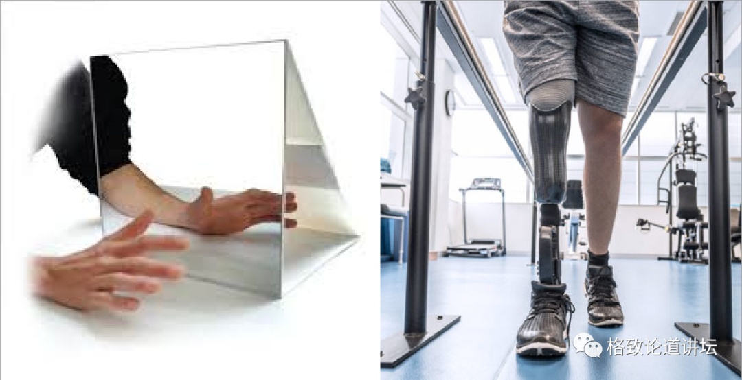 对于这个理论,还有一些可以支持的证据,就是这种幻肢痛的治疗方案。比如镜像疗法:通过一个镜子,让病人感觉他的手或者脚还在,还能动,还能感知。还有一种疗法是装上假肢。这些方式是通过欺骗大脑,让它觉得被截掉的肢体还在、还能运动和感知。在这种情况下,疼痛就可以得到很大程度的缓解。
