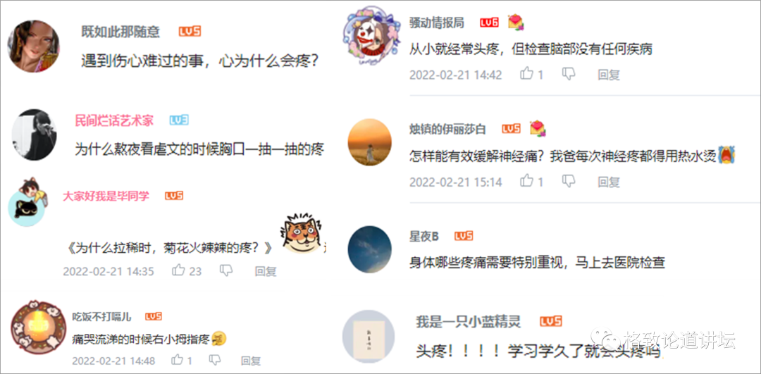 疼痛这个话题与大家的生活密切相关。在演讲之前,我们也在网上征集了一些关于疼痛的问题。果然,大家对这个问题都特别地关注,也提出了很多有意思的问题。