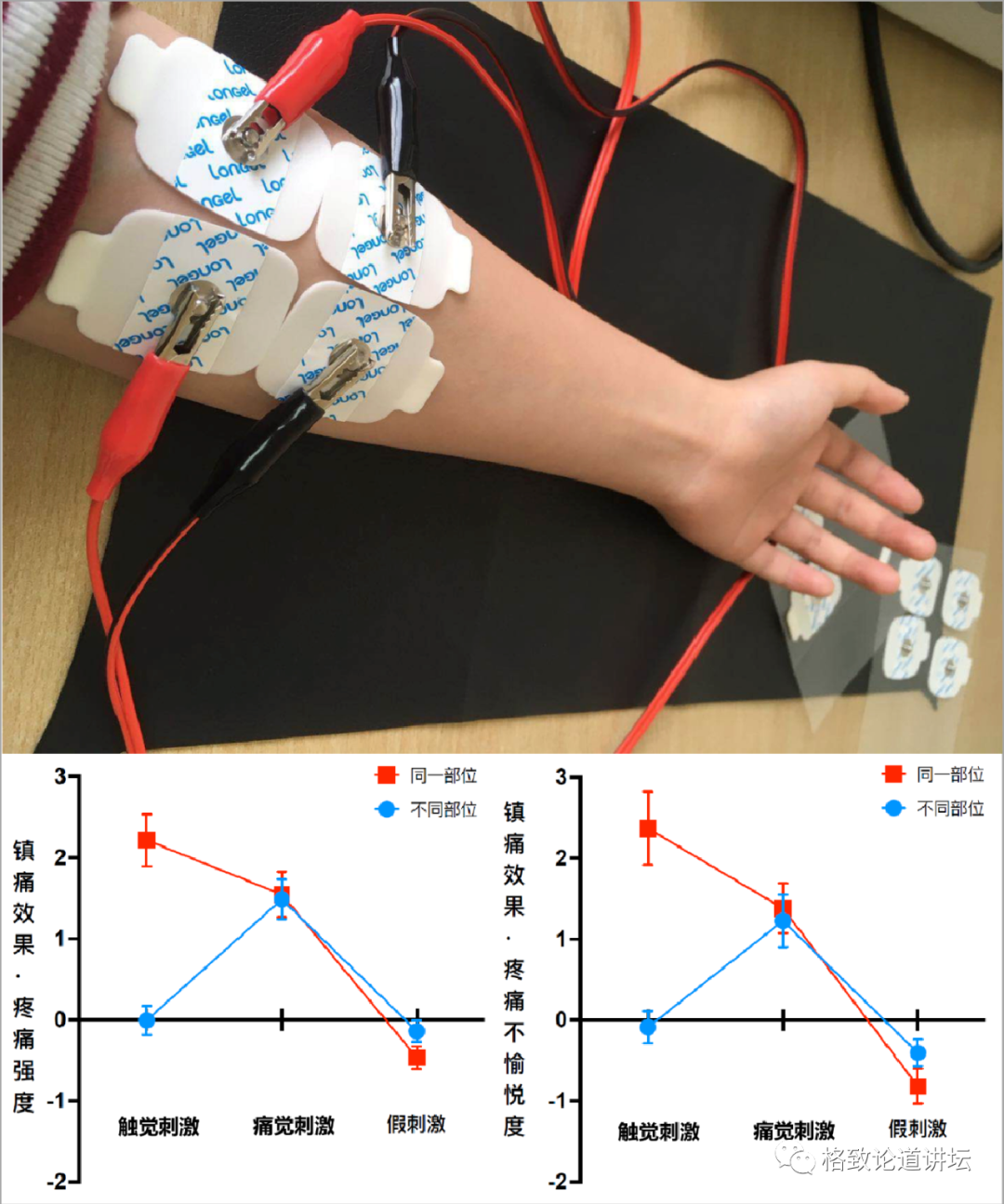 我们做了实验来验证这两个理论。实验室里,在相同的部位和不同的部位,我们用触觉刺激和痛觉刺激观察镇痛的效果。我们发现,触觉刺激在相同的位置起到了镇痛效果。比如说我哪里痛,就应该去揉那里、去吹那里,这个时候它起到了一个好的镇痛效果,在其他位置不起镇痛效果。相反,如果是一个痛觉刺激,它在同侧手或者另一侧手,在不同的位置都可以起到相同的镇痛效果,有全局镇痛的作用。不管是感觉层面还是情绪层面,得到的结果都是一致的。