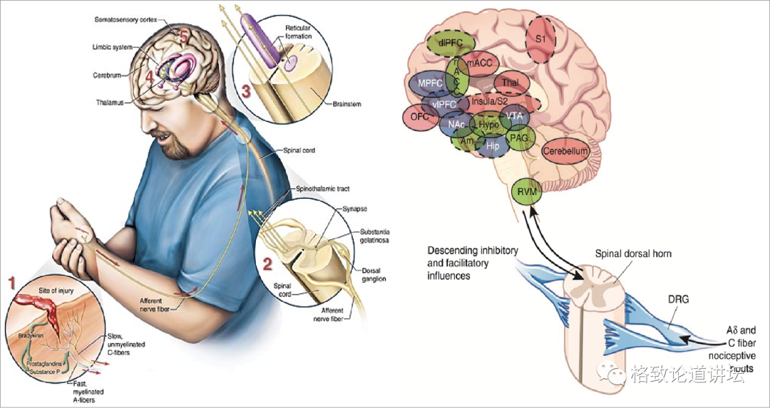 疼痛调节的区域既可以放大疼痛,又可以减小疼痛。比如在我们焦虑的状态下,疼痛会变得更强;又比如在我们注意力转移的情况下,疼痛会减弱。疼痛实际上是在这么多脑区组成的一个有机整体下产生的,所以疼痛是复杂的、多变的,而且是非常重要的。