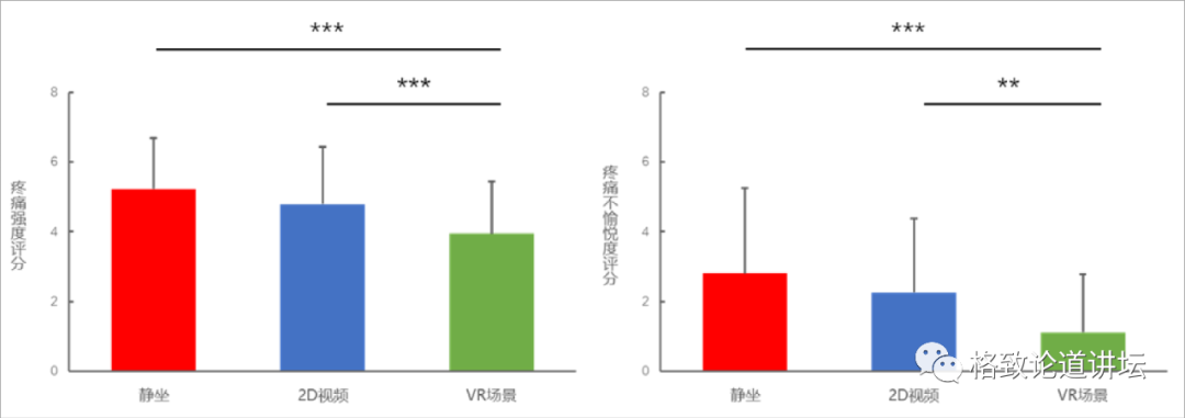 我们来做这个实验,看它到底能不能缓解疼痛。实验设计了三个条件,红色的就是什么也不干,第二个条件就是看刚才的2D视频,第三个就是VR环境。在VR环境中,不管是感觉层面还是情绪层面,疼痛确实都可以被大大地缓解。