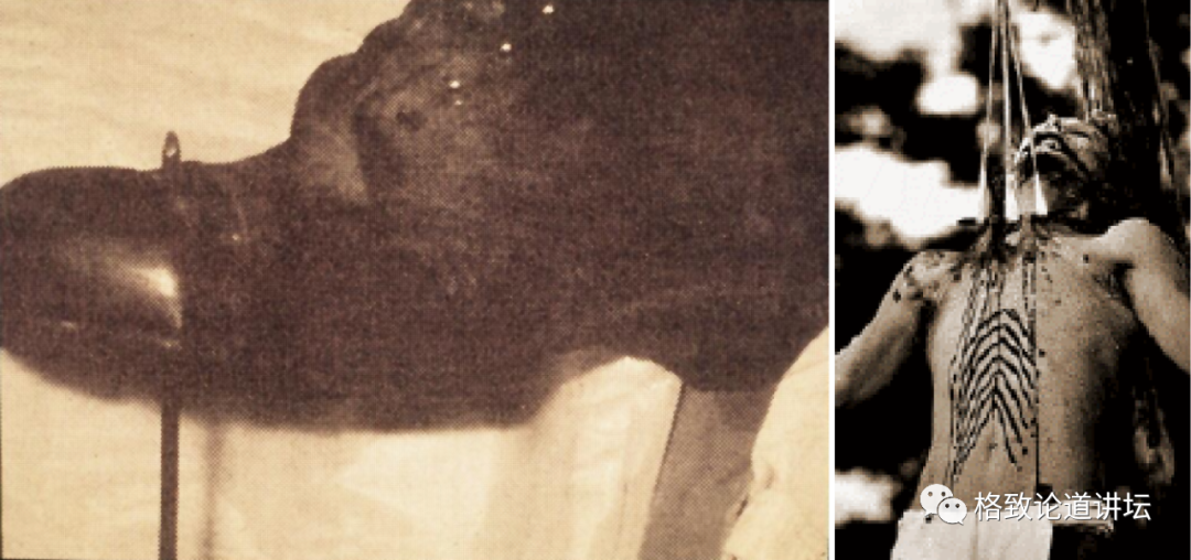 右边这张图更加血腥。某个部落中,一个人被三个钩子勾住皮肤吊起来了。大家觉得他也很疼,对不对?但是根据他当时的行为反应、生理反应以及后面的自述,他并不是很疼。其实这是一个古部落选取首领的一种仪式,经过这个仪式之后,他就可以证明自己是坚强的、勇敢的,然后马上就可以当首领了。想到能当首领之后,这个疼就不是那么回事了,所以他感觉并不是很疼。