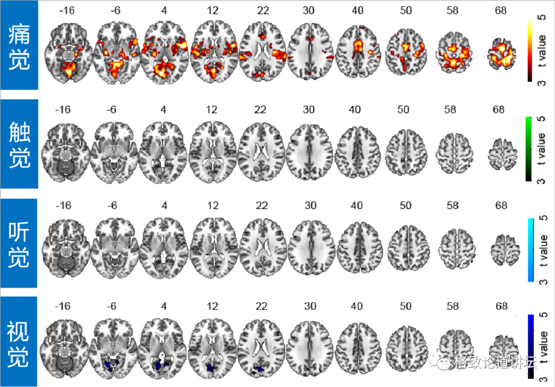 当我们给出疼痛刺激的时候,有很多脑区被激活了,如这里红色的区域。但我们换成其他的刺激,如触觉刺激、听觉刺激、视觉刺激时,也有很多脑区被激活。这是什么意思呢?有一些共同的区域,不管是什么模态的刺激,它都会被激活。