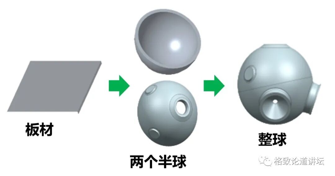 这里展示的是载人舱研制的流程示意图,我们首先要制备一张大的板材,将大的板材分别制备出一个上半球和一个下半球,再将两个半球进行合拢,最终形成一个整球。
