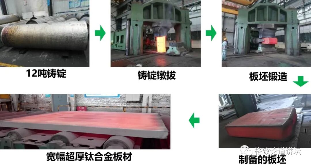 这是板材制作的一个过程。我们先熔炼12吨铸锭,将铸锭加热到1000摄氏度左右后进行反复地揉。因为材料在使用时非常硬,但是在1000摄氏度左右它就比较软。我们像揉面一样把这个材料反复来回地揉,使材料均匀一致。最终我们做出来一张大概有3米宽、120毫米厚的板材。