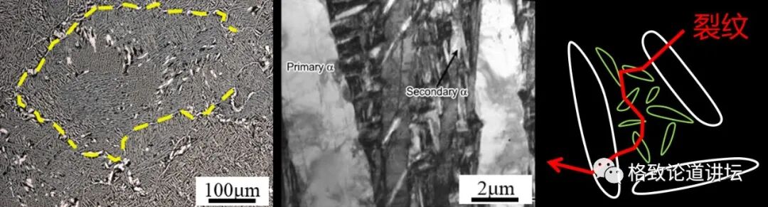 于是我们研发了钛合金的多级片层组织,相当于是有很大的片层,也有非常小的片层。当裂纹在遇到这些小片层的时候,就会在小片层之间发生曲折拐弯的扩展,从而使得裂纹扩展的路径非常曲折,以此阻碍裂纹的扩展。
