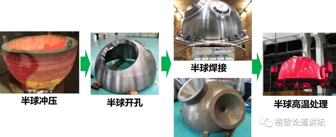 紧接着,我们用这个板材冲压成一个半球,这个半球相当于我们吃饭用的碗一样。再将半球表面进行开孔,开完孔之后进行部件焊接,最后在高温下进行热处理,完成半球的制备。