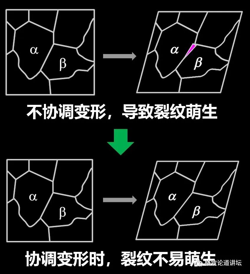 在右上角这个图里可以看到,不协调变形会在这个地方产生裂纹,我们通过化学成分调控就可以使两个产生协调变形,从而最终延迟裂纹的萌生。