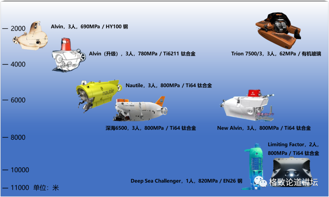 那还有没有其他载人潜水器和载人舱呢?这个图展示的是国外从1960年开始研制的一系列载人潜水器,大部分都是承载三个人的,这些载人舱的材料由早期的钢替换成了钛合金。