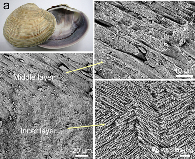 我们从自然界里去学习,从自然界里面找一些比较坚韧的材料进行观察,比如贝壳。我们把贝壳放在显微镜下放大几万倍进行观察,可以看到贝壳里面有好多个层状结构。那么当这些层状结构遇到裂纹时,会逐个阻碍裂纹的扩展,相当于裂纹扩展时候的阻力变大了,裂纹的路径非常曲折。