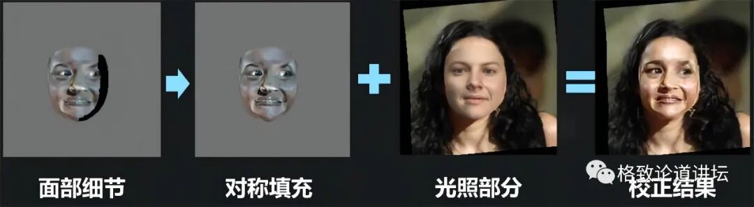 由于面部细节是对称的,所以我们就用对称性对它进行一个填充,然后再加回到刚才我们估计的光照部分,就得到最终的校正结果。大家看这个校正结果,黑边去除了,这就是一个非常高保真的校正结果。