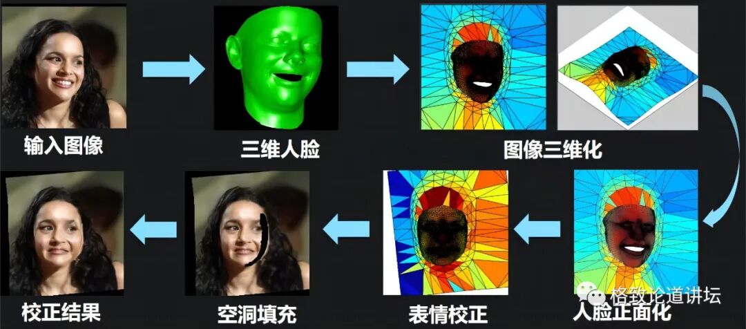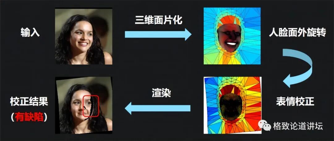 到此我们就可以回顾一下整个人脸转正的流程。首先根据一张输入图像,我们重建它的三维人脸;其次,将整张图像变成一个三维物体,在三维空间中对它进行转正;然后,把表情校正,重新成像;再把暴露出来的这半边脸给填充好,就得到了最终的校正结果。