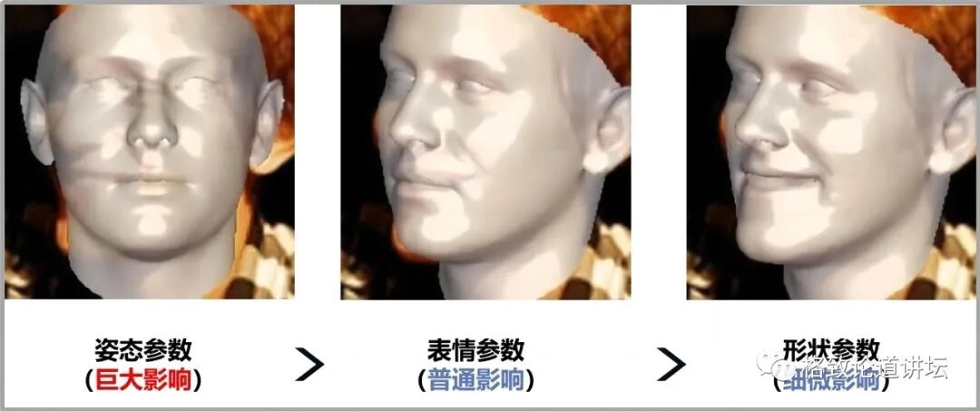 三维人脸姿态、形状和表情这三组参数,它们的重要性是完全不一样的。其中姿态参数最关键,只要姿态参数偏上一点,整个人脸就偏掉了,其次是表情参数,最后才是形状参数。如果不加区分把这些参数都送给神经网络学习,神经网络就会浪费资源在那些不重要的参数上,也就是说它不会抓住重点。