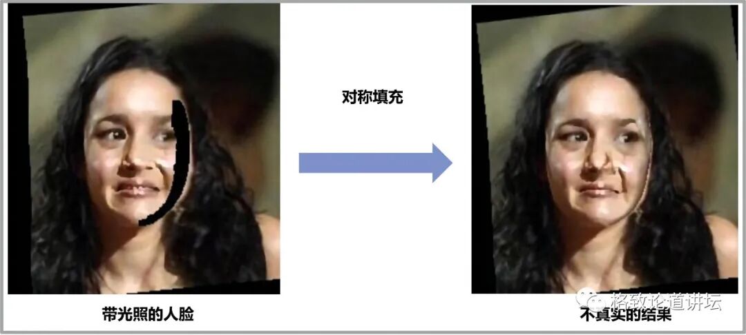 想象一下,假设一束光从人脸一侧打过来,人脸会变成一半明一半暗的状态,也就是俗称的“阴阳脸”。在室外环境下,光照就会更加复杂,我们就更无法使用对称性的假设。如果直接进行对称性的填充,只能得到一个非常不自然的结果,就像图中她的右半边脸有不自然的发黑现象,这显然是我们不想看到的。