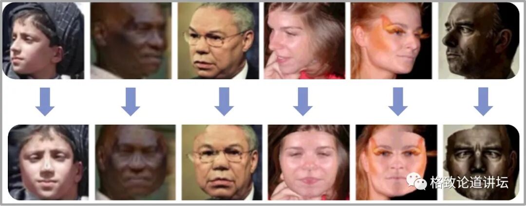 我们就想到,如果能从一张人脸图像生成他正面的无表情图像,再送去识别,不就解决这个问题了吗?像上面这样,侧脸图像被校正成正脸,这时候就可以进行匹配了。